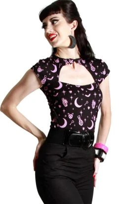 Cast a spell and call in your magic! Featuring a whimsical crescent moon, love potion and spell print this flattering, peephole top is demure & cheeky without sitting too low on the décolletage. The sleeves are cute cap cute which covers the upper shoulder.