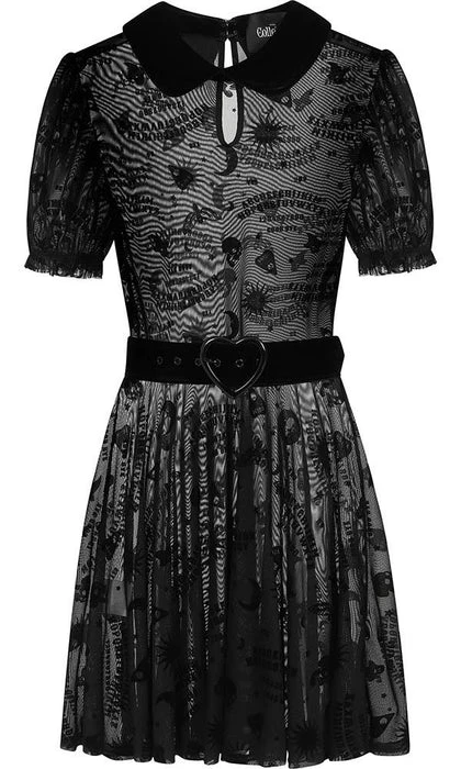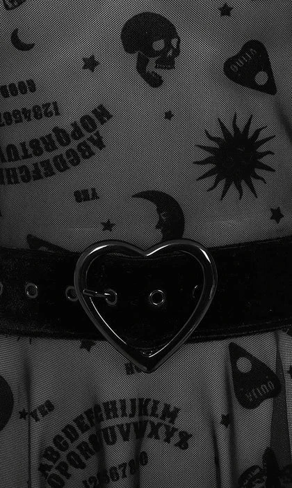 Prepare to summon your inner dark side with the amazing Ana Ouija Skater Dress. This is a sheer mesh throughout with a velvet collar, heart-buckle belt and all-over flocked bespoke design. It has puffy sleeves and a cute flippy skater skirt to ensure that cute meets cult in just the right measure. Fastening with a cute back button at the collar, you can wear this dress, under, over, or just on its own, however, be sure to match with your favourite High Heels.