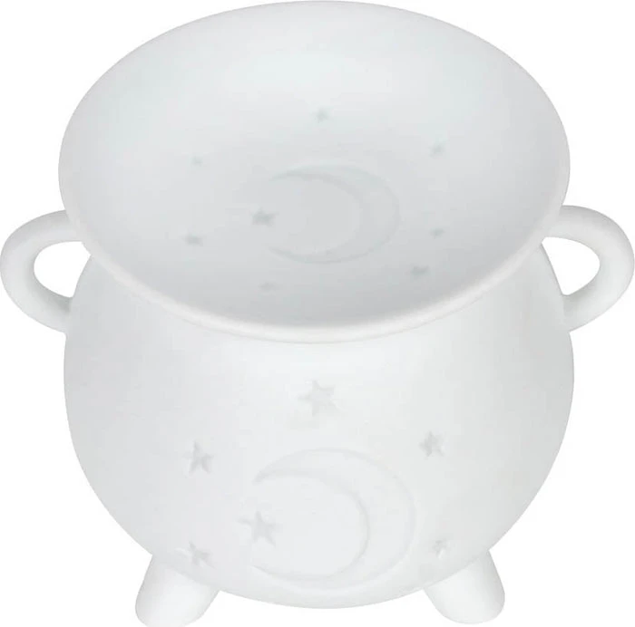 This white cauldron burner can be used to warm wax melts or diluted fragrance oils to beautifully fragrance the home. This white style features an engraved crescent moon and stars on the side.