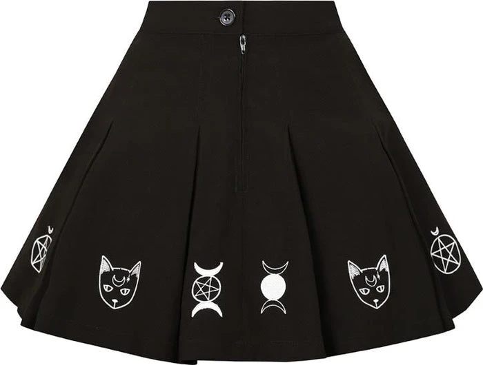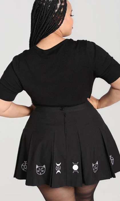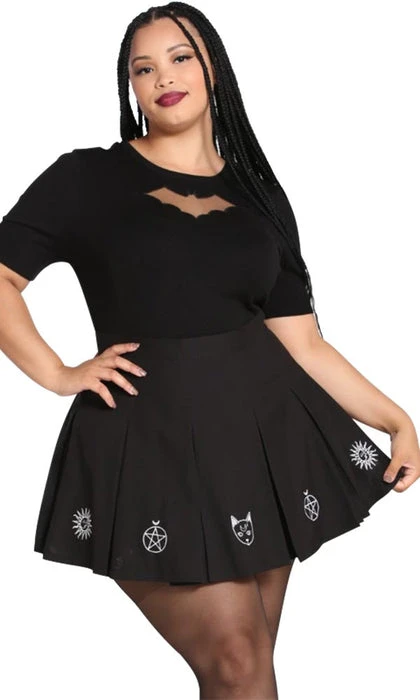 Add some subtle spook to your wardrobe with the Dawn Mini Skirt. The black pleated mini skirt adds a witchy vibe with the white embroidery on each pleat. Style with a black top or a some thigh high stockings for that ‘goth school chic’ look.Â
