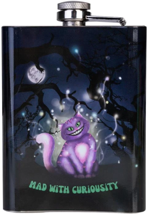 Mystical themed flask featuring a grinning cat and forest scenery