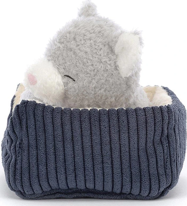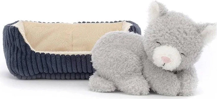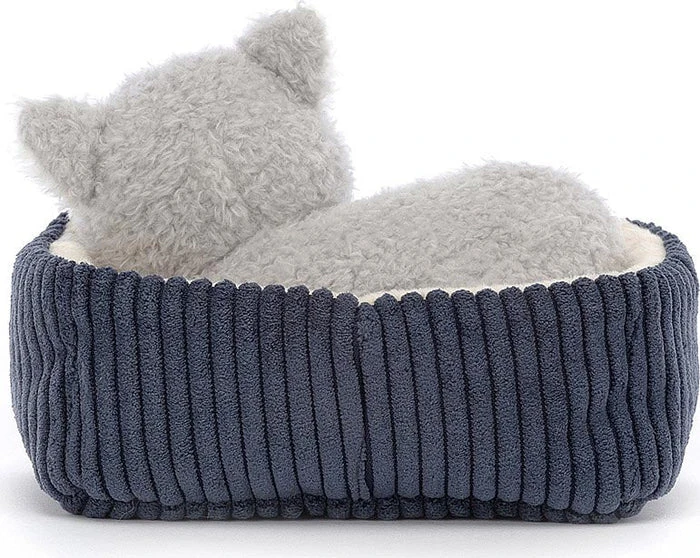 If you lift Napping Nipper Cat up, be very careful not to wake them! This gentle kitten has cloudy-soft fur in soothing pebble grey, with a cream-splash snoot and matching perky ears. All curled up in a cordy blue bed with pretty buttercream lining, someone’s dreaming of scruffles and salmon.