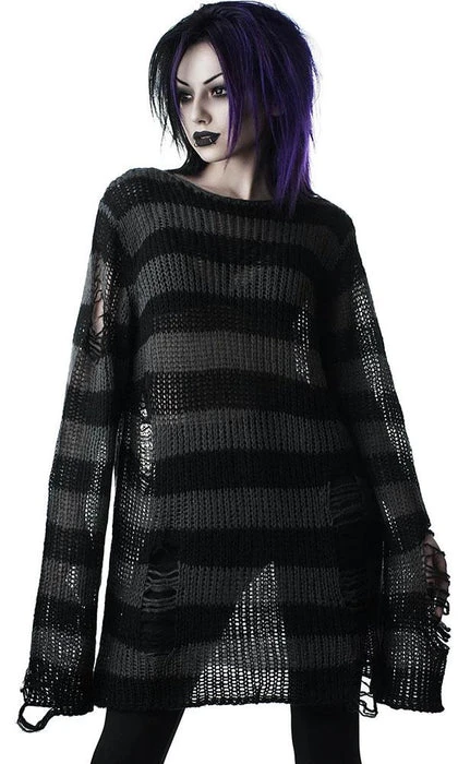 Channeling some 90s grunge with the ‘Ash’ soft-knit sweater, perfect for layering – or wear as a statement piece. Contrasting black and grey striped body; with extra long length so can easily be dressed up or down. With distress detailing and low neckline. Ideal for cozy fashion, midnight promenades with the moon and hungover Sundays.