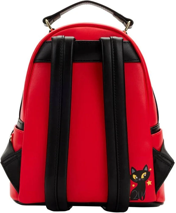 The Loungefly Hocus Pocus Dani Binx Mini Backpack is made of vegan leather (polyurethane). Bag has adjustable shoulder straps, sturdy metal hardware, and a removeable vegan leather bag charm. Additional features include applique, embroidered, debossed, and printed details. Take note of the coordinating inside lining.