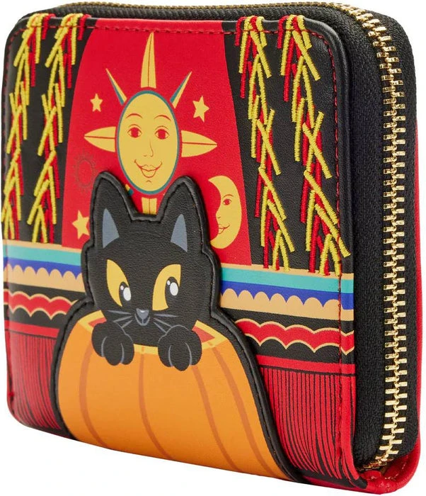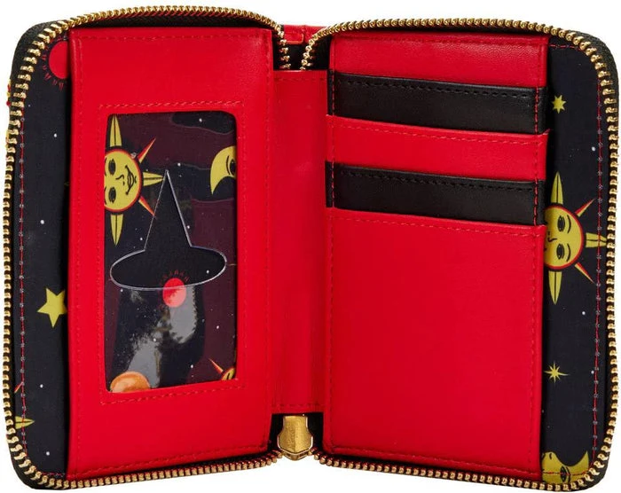 Celebrate the enchanting magic of All Hallows’ Eve with the Loungefly Hocus Pocus Dani Binx Zip Around Wallet. This spellbound accessory pays tribute to the special bond between Thackery Binx and Dani Dennison. On the front, Thackery Binx peeks out from inside a pumpkin. Dani’s witch costume appears behind him, displaying a motif of suns, stars, and moons. On the back of the wallet, Thackery Binx makes an encore appearance as he sits near the Black Flame Candle. With 4 slots for holding cards and a clear slot to hold your ID, this bewitching accessory is sure to keep all your treasures safe as you run amuck on any adventure.