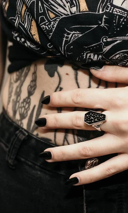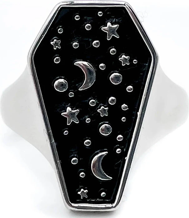 The cosmos is calling you with the Cosmic Coffin ring. Be at one with stars with Statement Cosmic Coffin ring, showcasing an array of moon and stars sat on a black background