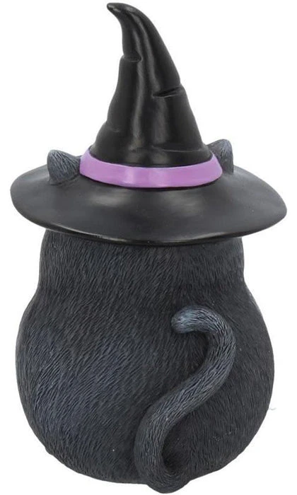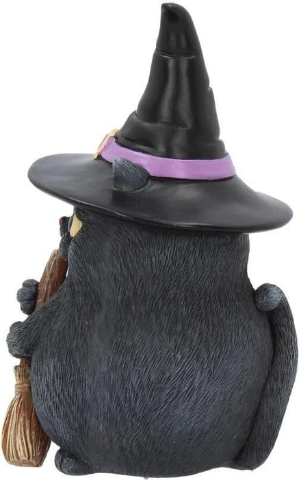 Sitting upright, eyes bright with excitement, this cute chubby black cat clutches a wooden broom in their front paws. On their head, their ears poke through the brim of a large black witches’ hat. Cast in the finest resin before being lovingly hand-painted, this cute kitty is the purrfect ornament or sneaky garden statue!