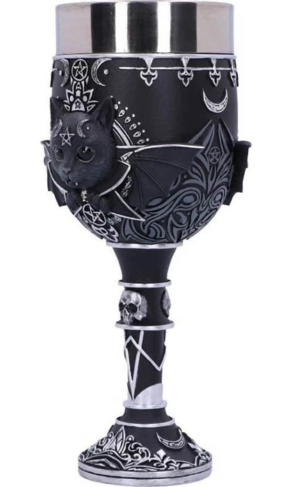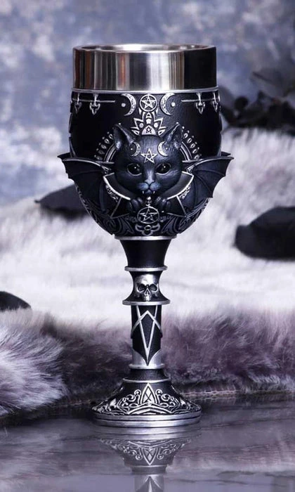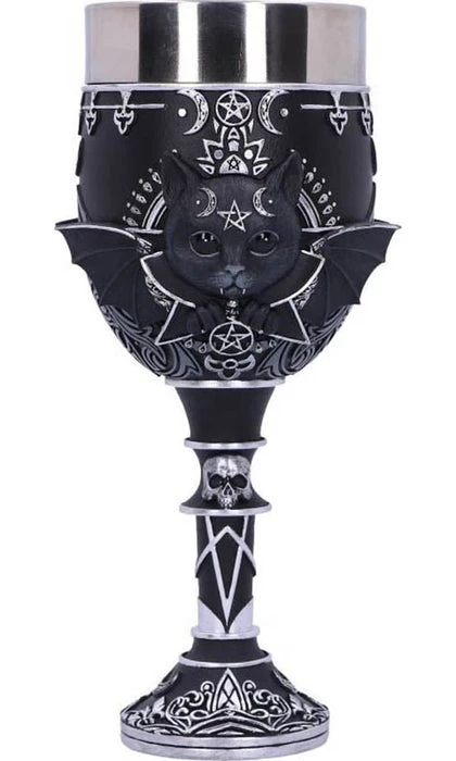 This black cat is the union of good and evil and appears to be a vampire spirit, encapsulated by bat wings protruding from the cat’s back. The Goblet is decorated in ornate silver detailing and satanic symbology. Cast in high-quality resin before being expertly hand-painted, this Malpuss Goblet is likely to be the cutest occultist you’ve ever seen.