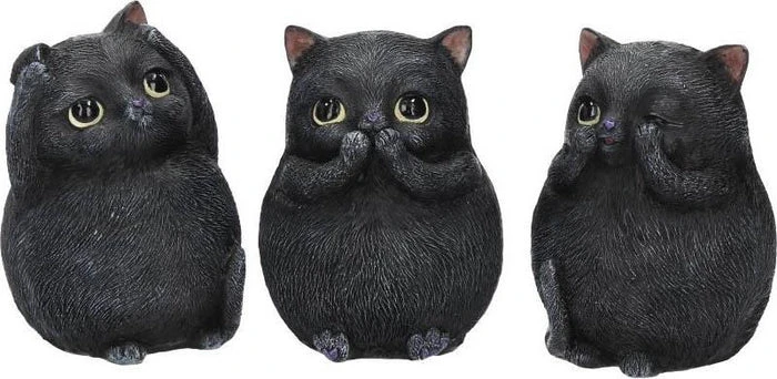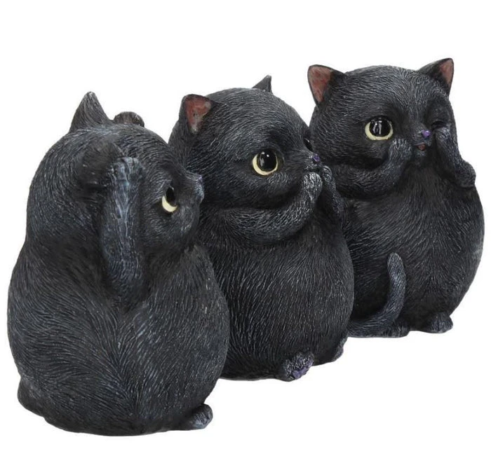Sitting side by side, these three wise kitties look up with adorable eyes with purple heart-shaped noses. One clasps their paws to their mouth, one blocks their ears, and one covers their eyes, sneaking a peek regardless. Cast in the finest resin before being lovingly hand-painted, these adorable animals are the perfect illustration of Confucius’ famous maxim: “See no evil, hear no evil, speak no evil”