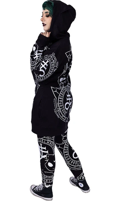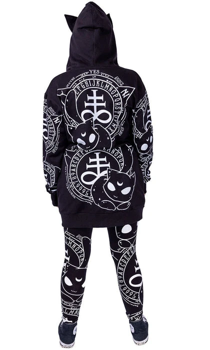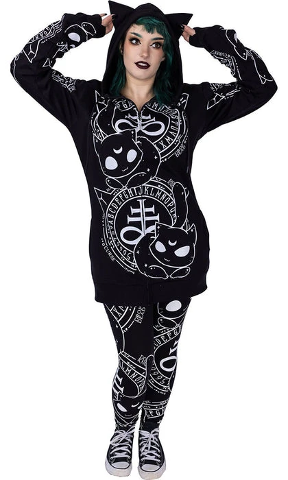 Cats are a goth’s best friend! So why not sport this super cozy longline kitty hoodie all winter long!? Covered in white witchy kitty motifs this hoodie is purrfect for all your witches and cool cats!Â