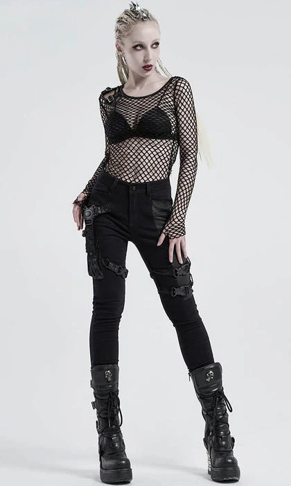 Unleash your inner Punk! The slim fit Vicious Top is made out of black elastic fishnet fabric and features two glossy fabric straps with silver buckles and eyelets on the left shoulder. Long sleeves complete this dramatic look – slide your fingers into the mesh and wear them as fingerless gloves.