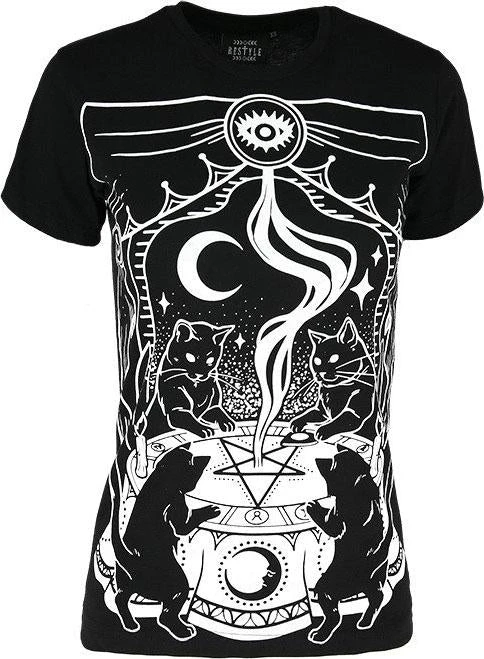 This fitted shirt features a stunning printed design with kitties using a summoning circle!