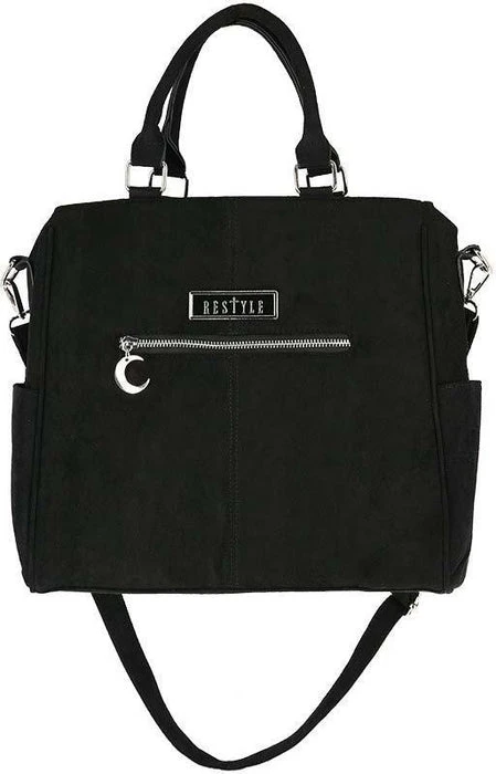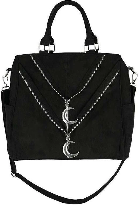An icon worthy of investment. Double Zipped Moon Tote is a head-turning handbag for the gothic woman on-the-go. Crafted from black faux suede, the roomy silhouette is embellished with lustrous Crescent Moons and zipped details. Split internal compartment make organisation a breeze, while silver hardware and moon charms promise to add magical flair to any ensemble. Make glamour part of your everyday, taking it from desk to dinner with ease. Carry yours by the top handle or opt for the removable crossbody strap to go hands-free.