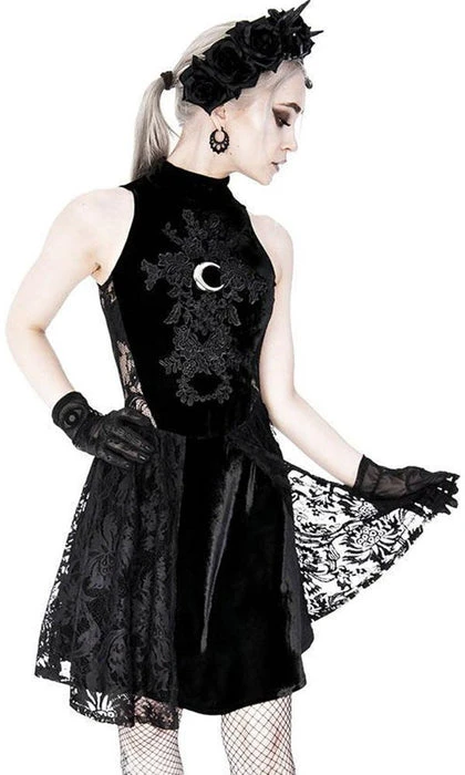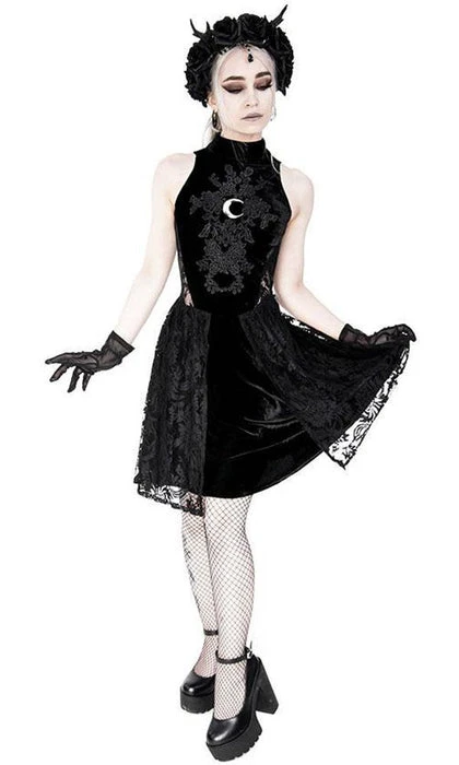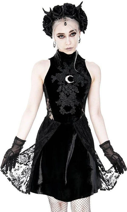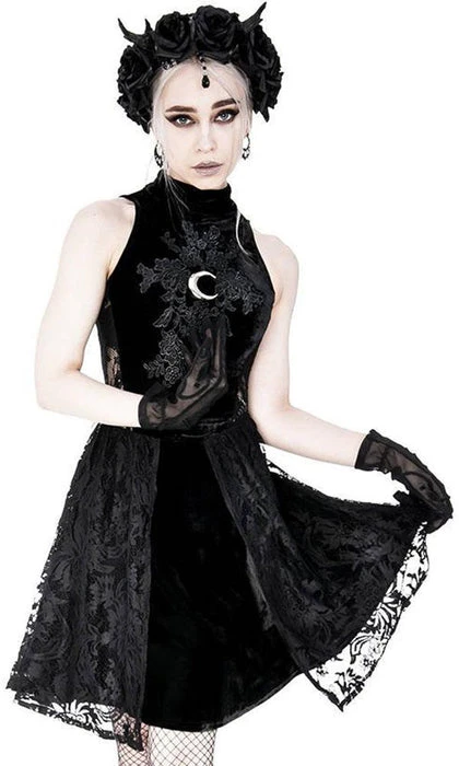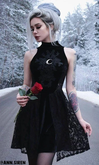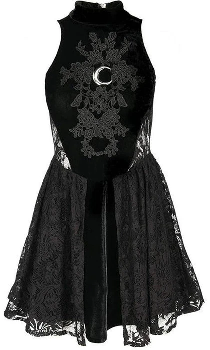 Inspired by Gothic Sailor Moon elements, this High Neck Crescent Moon Dress is perfect for dinners, dancing or simply basking in the moonlight. It features a beautiful soft velvet and lace design with a stunning silver crescent moon on the front.