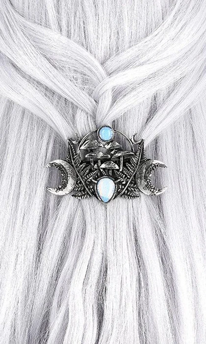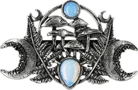 An intriguing creation composed of fern leaves, magic mushrooms and a crescents on the sides. Magic Forest Hair clip, perfect to give away, crafted in zinc alloy and embellished with moon stones.