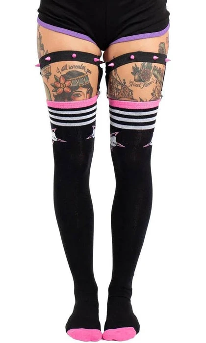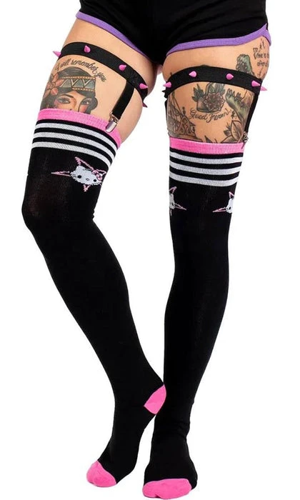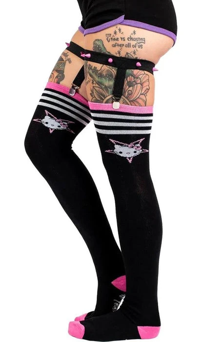 Well hello, evil kitty! These socks are just purrfect, aren’t they? They come to just above your knee and feature witchy and spooky knit-in designs. These thigh-high knit socks are killer!