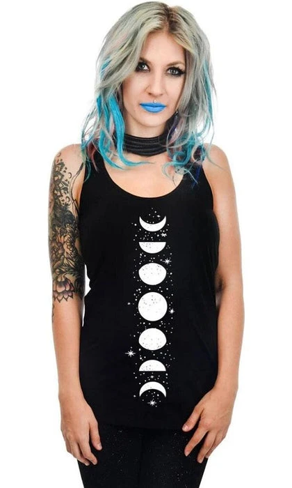 Soft, black jersey blended cotton tank top with slight aline fit body, racerback straps, and scooped hem featuring phases of the moon and stars printed down center front.