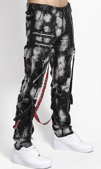 Imagine the chaos you could stir up in these bleached skinny fit pants featuring removable plaid straps, studs, and exposed zippers! Pant legs can be zipped for a change in fit, topped off with a zip fly and button closure.